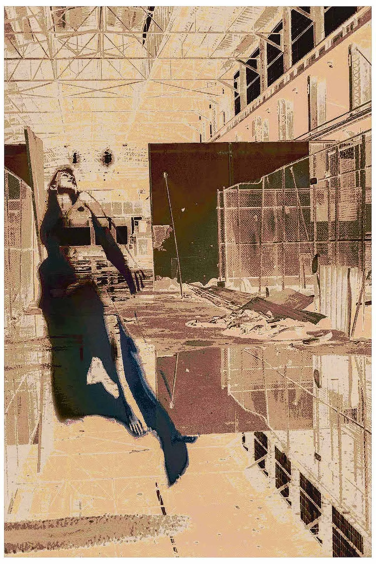 A female nude floats above a ruined factory landscape. Maybe she’s been working too hard.